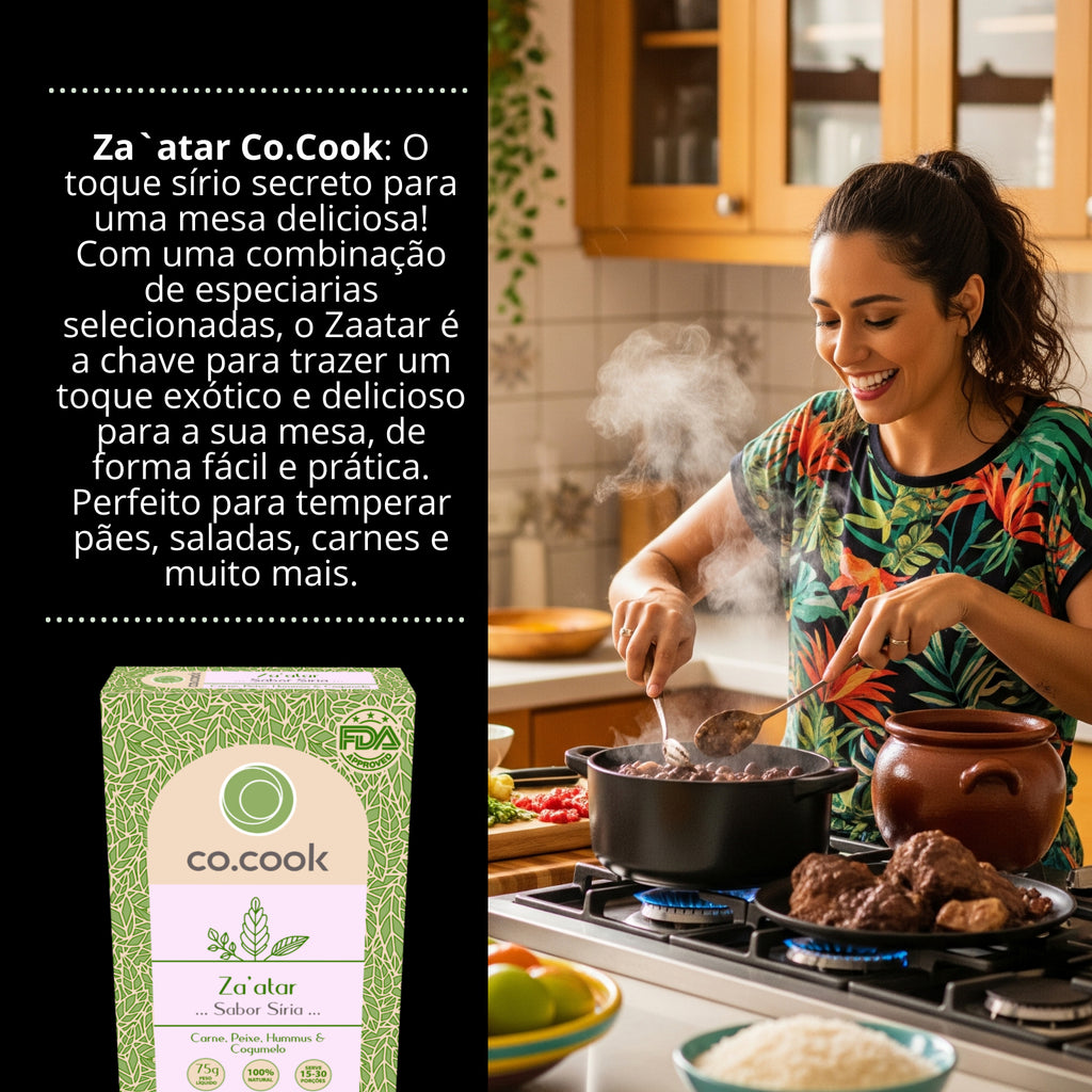 O Za’atar Co.Cook entrega um aroma marcante e sofisticado, ideal para pratos com vegetais, homus, legumes assados, carnes brancas e cereais integrais. Com especiarias como cominho, cardamomo e sumagre, proporciona equilíbrio digestivo, suporte imunológico e uma explosão de sabor que transforma preparos simples em receitas memoráveis.