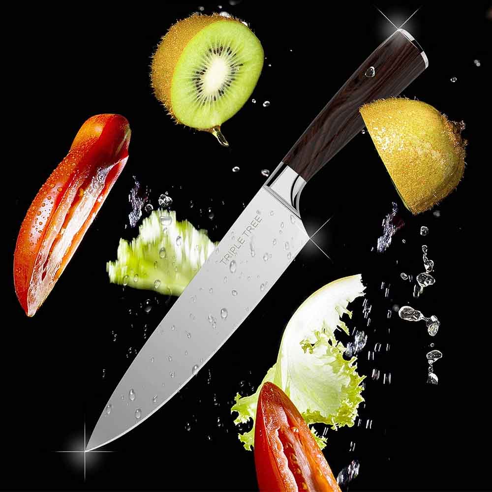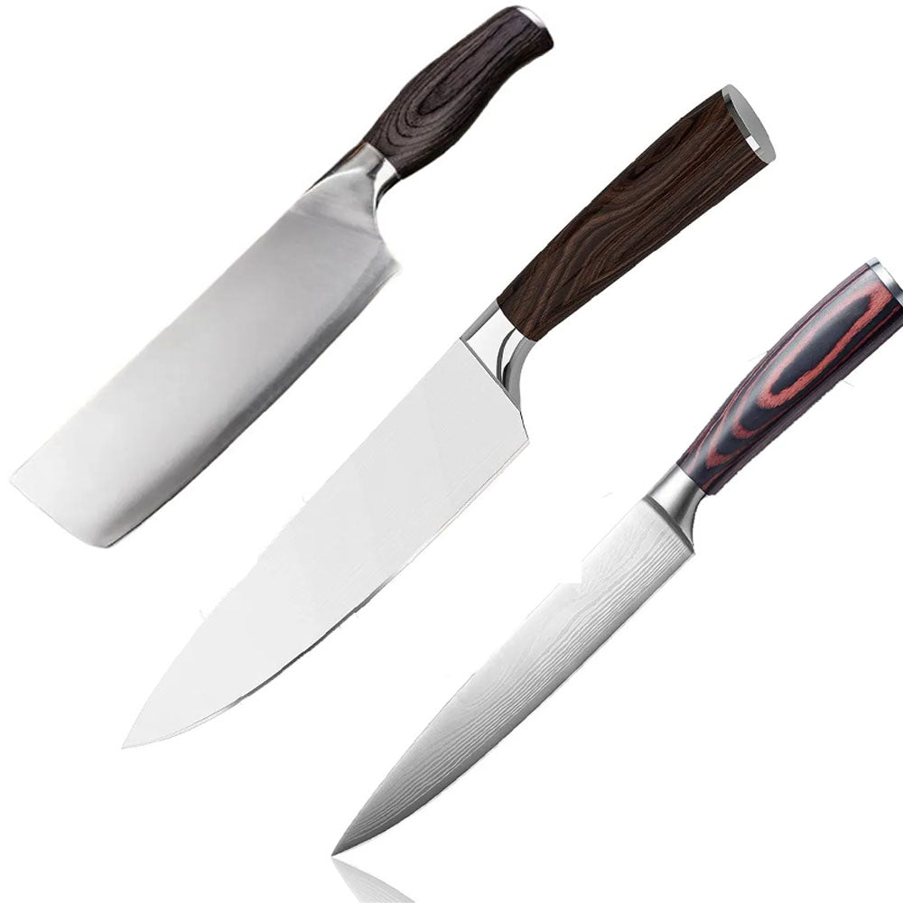 - O kit contém duas facas e um cutelo, todos com cabo ergonômico e confortável, que se adaptam perfeitamente à sua mão. As facas são ideais para cortar carnes, legumes, frutas e pães, enquanto o cutelo é ótimo para picar ossos, temperos e ervas.