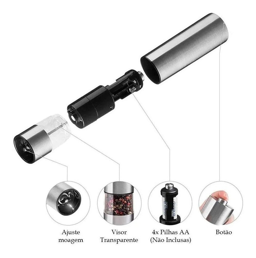 O nosso moedor elétrico tudo o que você precisa para deixar a sua cozinha mais prática. Ele é produzido em material altamente resistente à corrosão, durável e com excelente padrão de qualidade. Para facilitar o preparo de seus sofisticado pratos ele é ideal para realçar o sabor dos alimentos. O moedor possui um estilo moderno e refinado que combina com qualquer ambiente. Seu design é todo em inox mas possui um visor de vidro para facilitar a visualização do tempero, além de ser uma peça decorativa para qualquer cozinha. Ele é muito simples de utilizar sendo necessário apenas 4 pilhas do tipo AA (não inclusas) e apertar o botão de acionamento. Fácil abastecimento, bastando apenas retirar o revestimento inox e puxar para cima o conjunto do motor e pilhas (conjunto preto).  - Instruções de uso:  • Para abastecer: Puxe com cuidado a parte superior de inox e a parte preta e coloque as pilhas AA. • Adicione no compartimento os temperos de sua preferência. • Para moer: Retire a tampa de proteção e posicione o moedor no alimento. Aperte o botão para acionar a moagem ESPECIFICAÇÕES:  Dimensões: Altura 22cm x 5,5cm  Contém: Moedor De Tempero Elétrico Linha Premium Master Cheff